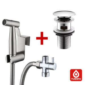 Ducha para WC y válvula de desagüe cromo brillo. Pulverizador de bidet wc y grifo higiénico de Inodoro de Acero inoxidable cepillado antihuellas